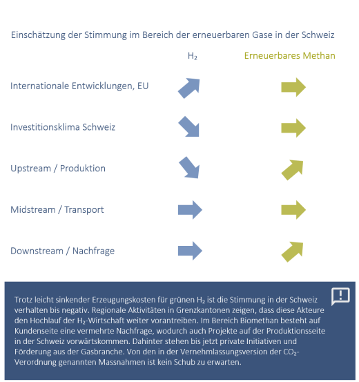 The supply of and demand for biomethane is developing positively in Switzerland. This is thanks to private initiatives and support from the gas industry. There is great potential in the use of livestock manure, although Switzerland faces additional challenges with its rather small-scale agriculture. The current version of the new CO₂ Ordinance (CO₂-Verordnung), which is still being consulted on until October 17, will hardly provide any additional impetus. According to our hydrogen marginal cost index HySuiX, the production costs for green hydrogen (H₂) in Switzerland have recently fallen. However, shortly before the planned publication of the Swiss government's hydrogen strategy, the mood in the industry remains cautious, although there important progress in regions close to the border. These topics are covered in the new Barometer, published by the Swiss Gas Industry Association in collaboration with E-Bridge Consulting and Polynomics. The Barometer is published twice a year and available in German and French. You can receive future issues by registering on the VSG Website.